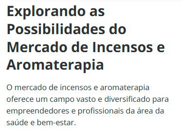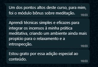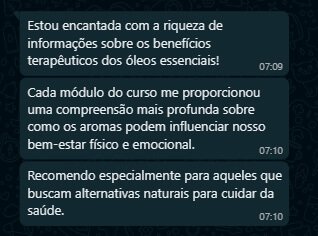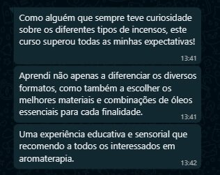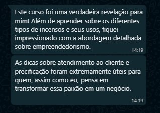 Não se trata apenas de adquirir conhecimento, mas de embarcar em uma jornada pelo mundo dos Incensos Naturais com total suporte. Nossa equipe de suporte estará sempre ao seu lado, assegurando que cada passo seja seguro e que todas as suas dúvidas sejam prontamente esclarecidas. Inicie sua jornada rumo à especialização em Incensos Naturais – a arte da criação de aromas está ao seu alcance!